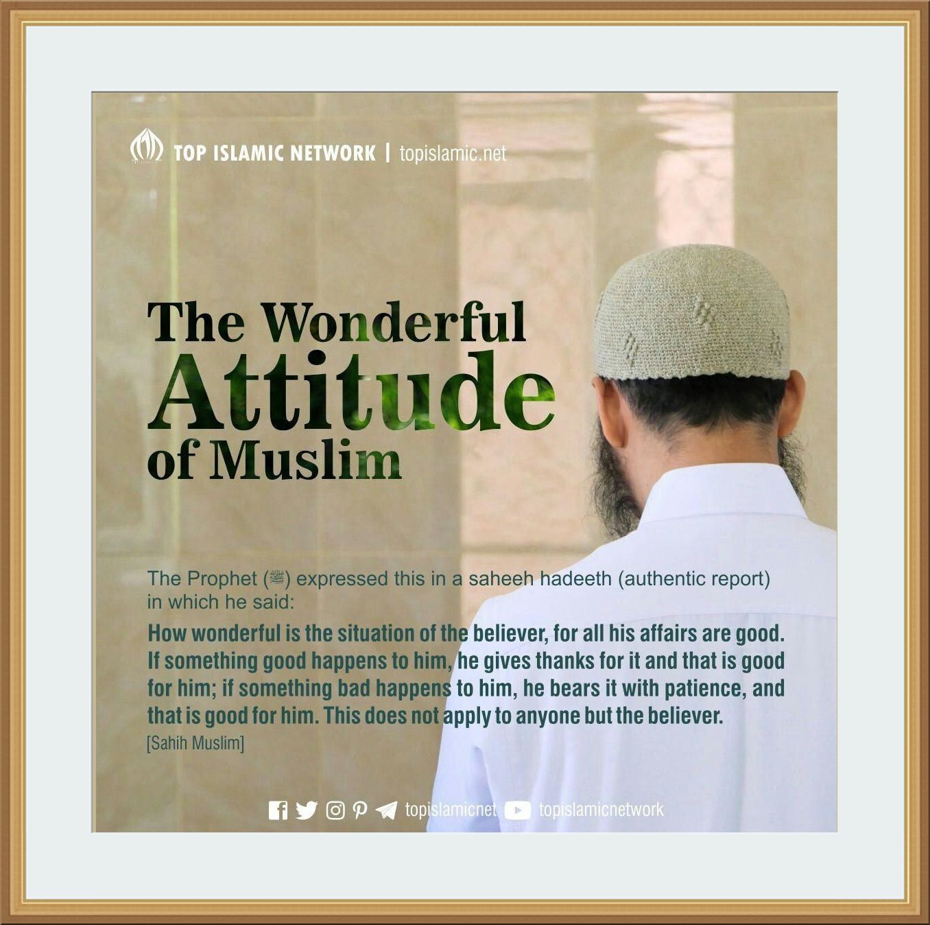 Strange are the ways of a believer for there is good in every affair of his and this is not the case with anyone else except in the case of a believer for if he has an occasion to feel delight, he thanks (God), thus there is a good for him in it, and if he gets into trouble and shows resignation (and endures it patiently), there is a good for him in it.